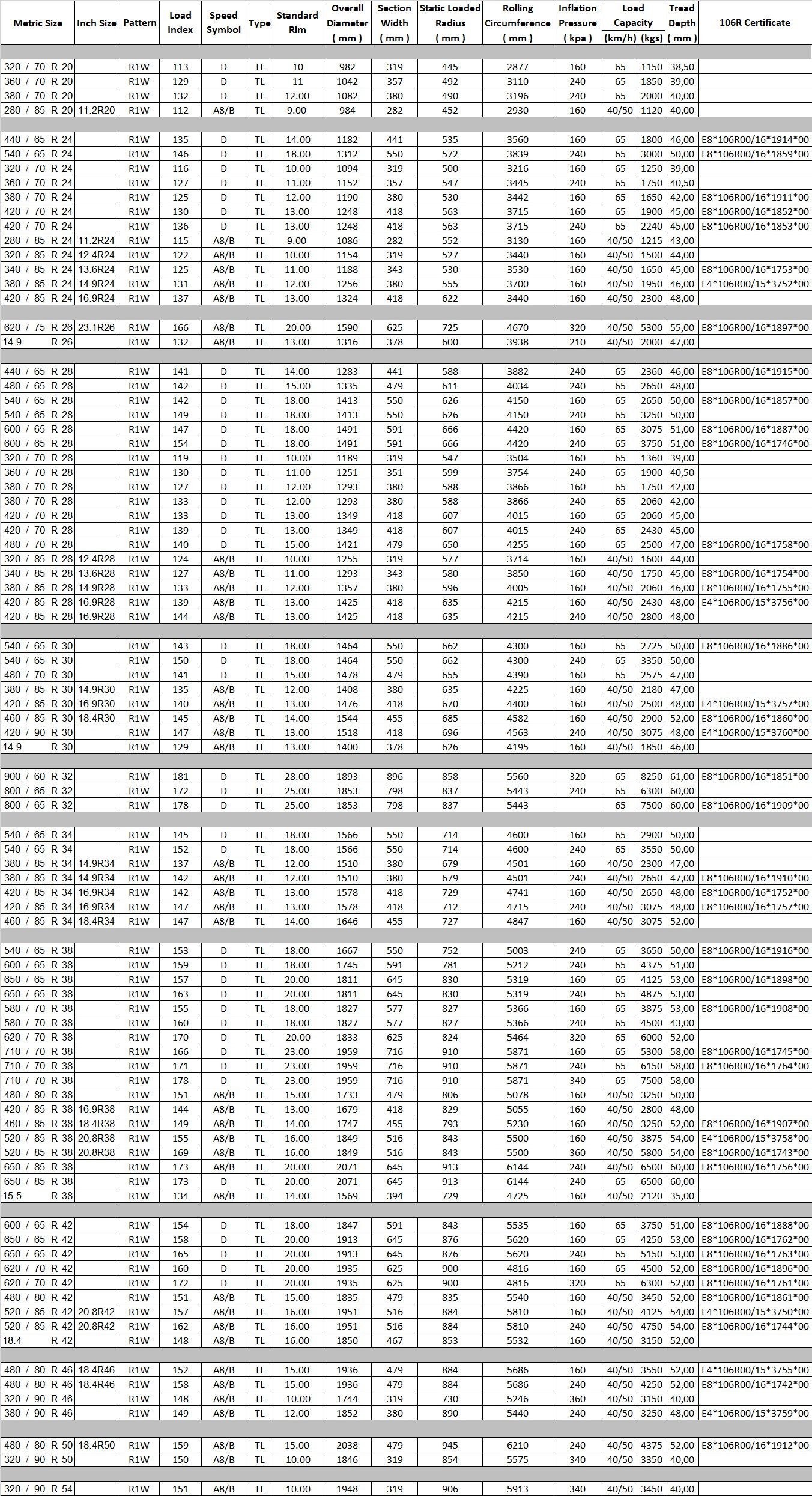 For every specific type and/or wheel, instructions and figures on load, inflation pressure, speed etc. are stated in the sidewall of the specific tyre by the manufacturer.