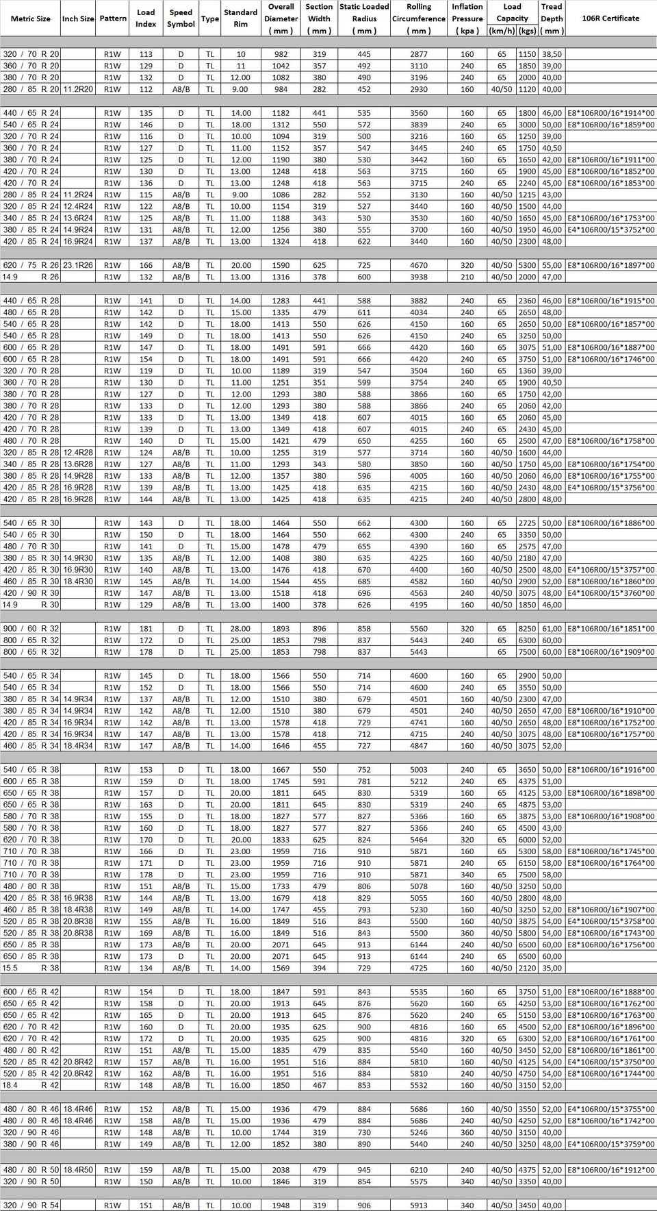 Für jeden spezifischen Typ und / oder jedes Rad sind Anweisungen und Angaben zu Last, Luftdruck, Geschwindigkeit etc. vom Hersteller in der Seitenwand des spezifischen Reifens angegeben. Im Zweifelsfall konsultieren Sie bitte die technischen Handbücher der ETRTO oder kontaktieren Sie uns. Montieren, befüllen Sie Reifen nicht mit Luft oder verwenden Sie keine Reifen / Rad-Kombination, bis alle möglichen Zweifel beseitigt sind.