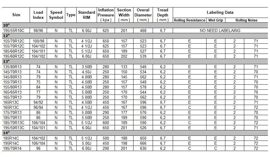 Für jeden spezifischen Typ und / oder jedes Rad sind Anweisungen und Angaben zu Last, Luftdruck, Geschwindigkeit etc. vom Hersteller in der Seitenwand des spezifischen Reifens angegeben. Im Zweifelsfall konsultieren Sie bitte die technischen Handbücher der ETRTO oder kontaktieren Sie uns. Montieren, befüllen Sie Reifen nicht mit Luft oder verwenden Sie keine Reifen / Rad-Kombination, bis alle möglichen Zweifel beseitigt sind.